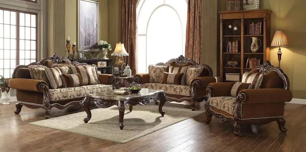 Crafted with a penchant for Old World artistry and French Provincial inspired, the Jardena loveseat is the perfect addition for traditional living rooms. Balancing comfort and style, this shapely arched loveseat features Queen Ann legs and an elegantly upholstered floral seat cushion and seat back and rolled arms in velvety brown. The two-tone welt trim and elegant scrolled and grooved details and crests on the cherry oak carved frame heighten its classical appeal. Four accent pillows in coordinating colors and patterns add comfort and visual appeal. An updated rendition of a classic piece, this beautiful loveseat is perfectly suited for any room décor.