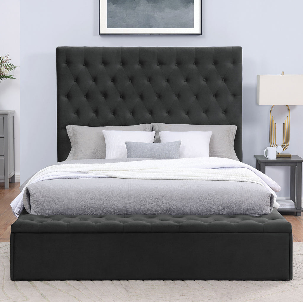 ATHENELLE Queen Bed, Dark Gray, 98"L X 67 3/4"W X 59 1/2"H, 132.65lbs. Your sleep is about to get even better in this glamorous bed! Lie down and look up on an oversized headboard that towers over a spacious platform design. Tufting is laid out in diamond patterns found on both ends of the bed; the footboard even offers storage for your extra pillows and blankets. While the low profile makes it physically easier to get in and out of the bed, the softness of this fully upholstered fabric frame will take you in and out of dreamland in a jiffy.