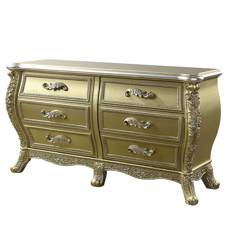 OverviewWhy go for subtle when you can go for grand, with the Cabriole Dining Room Set by Acme Furniture you can achieve it. Lavish and intricate this collection features floral and classic acanthus leaf moldings throughout each piece that creates cohesiveness. The dining table will be the focal piece of any space, the bold design stands out on its own. The chairs are great for long dinner parties with their cushioned seat and backrest, the backrest features crystal-like button tufting and classic nailhead trim. Complete your dining room with your choice of a server and mirror or a curio.