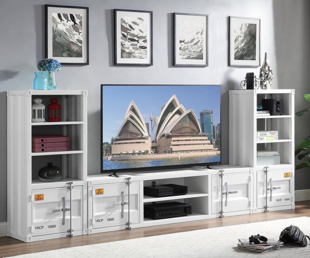 Anchor your entertainment space in effortless style with the Cargo entertainment set. The impressive design elements mix contemporary and industrial themes into one impressive transitional look. The TV stand and 2 side piers feature a unique fun finish with metal accents that will revitalize any space. With multiple storage compartments and open media shelves, there is plenty of space for your media components and collectibles.
