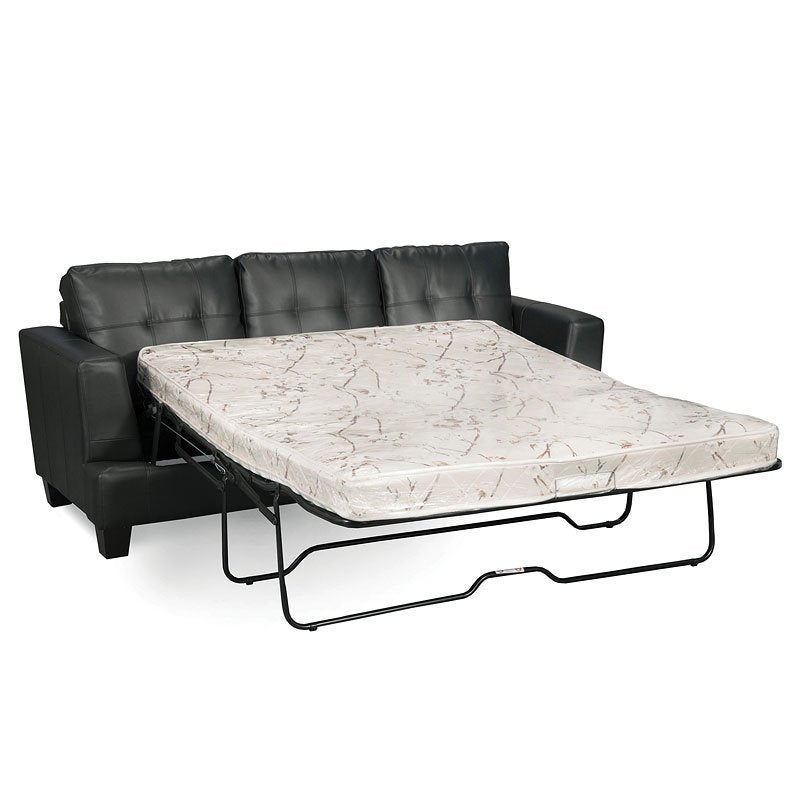 A fresh design and fabulous bold upholstery breathes life into any transitional space. Delivering casual elegance, this sofa sleeper offers superb comfort for relaxing, lounging, and sleeping on a pull-out mattress. Versatile black premium 2mm breathable leatherette creates the perfect, easy-care cover. Tufting on three back cushion adds a softening touch. Enjoy coordinating cappuccino finish chunky legs that change up its dramatic palette.