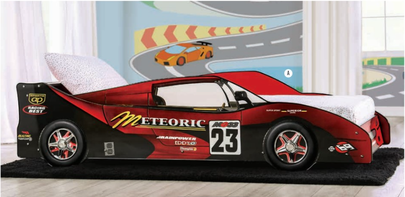 DUSTRACK Twin Bed, Red, 82 1/2"L X 41 1/2"W X 23 1/2"H, 94.35lbs. For those aspiring race car drivers, here's the perfect bed to feed their aspirations! With replicated wheels and sponsorship markings, this race car bed is a dreamer's delight. And it's sturdy, too. Metal support structure and included slat kits ensure a stable, safe, and fun space.