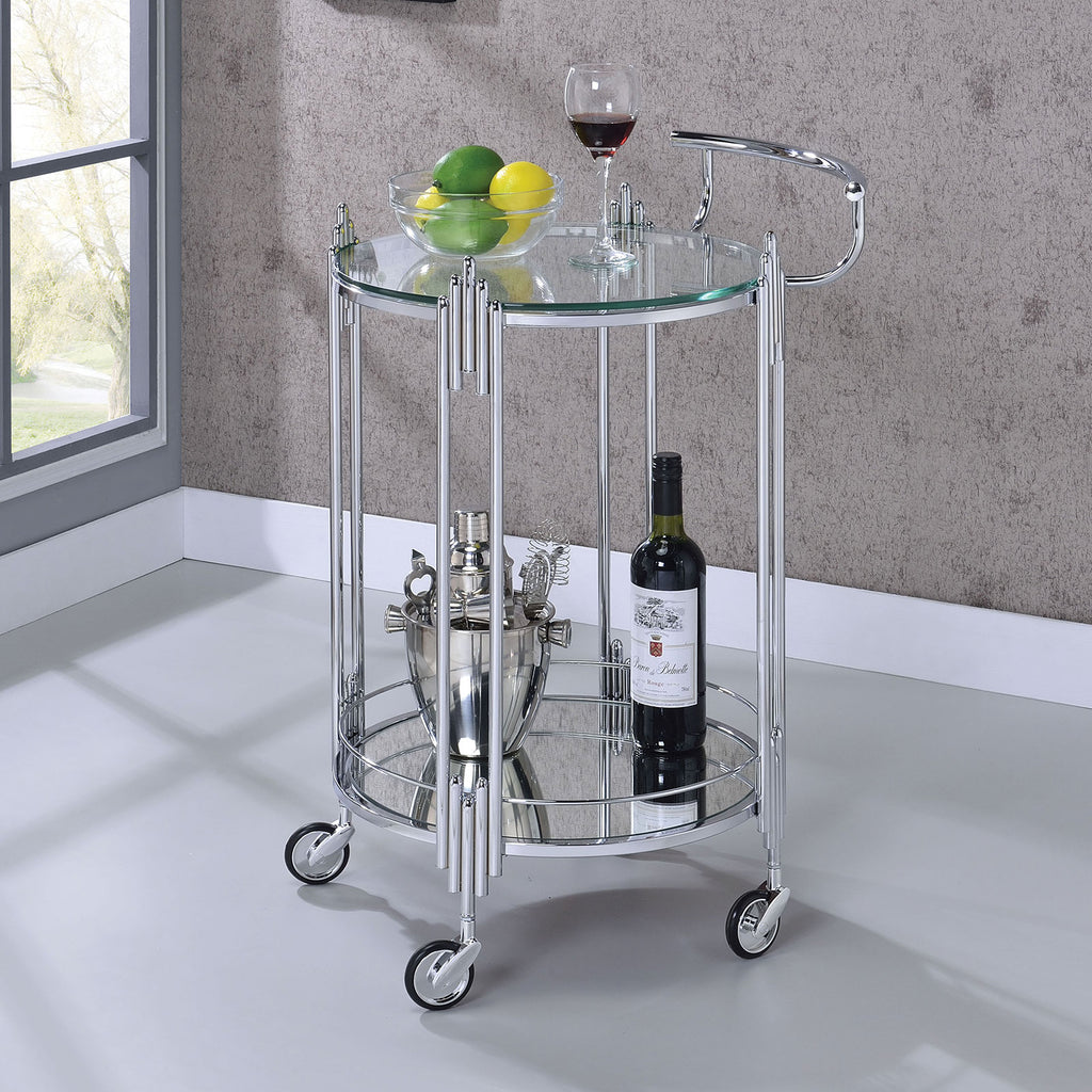 Serve in style with this round chrome cart with caster wheels and a 5mm mirror bottom shelf.