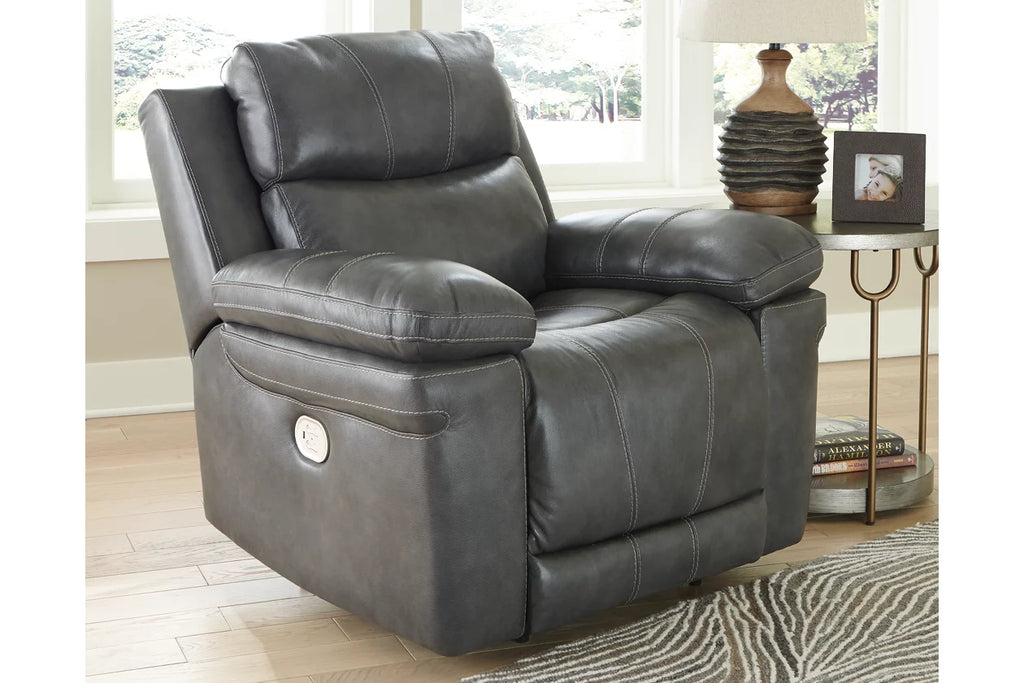 When you curl up in the Edmar power recliner with adjustable headrest, you won't want to get up. It has genuine leather throughout the seating areas, and a neutral charcoal gray hue that pairs up comfortably with most color schemes. This cozy recliner will be your go-to spot for watching TV, reading, or just closing your eyes and drifting off to sleep. Perfectly positioned cushions and overstuffed pillow top arms allow unparalleled relaxation. With a look that turns heads, this recliner has an extended ottoman to enhance comfort, and an adjustable headrest for a primo view of the TV even when you're fully reclined.