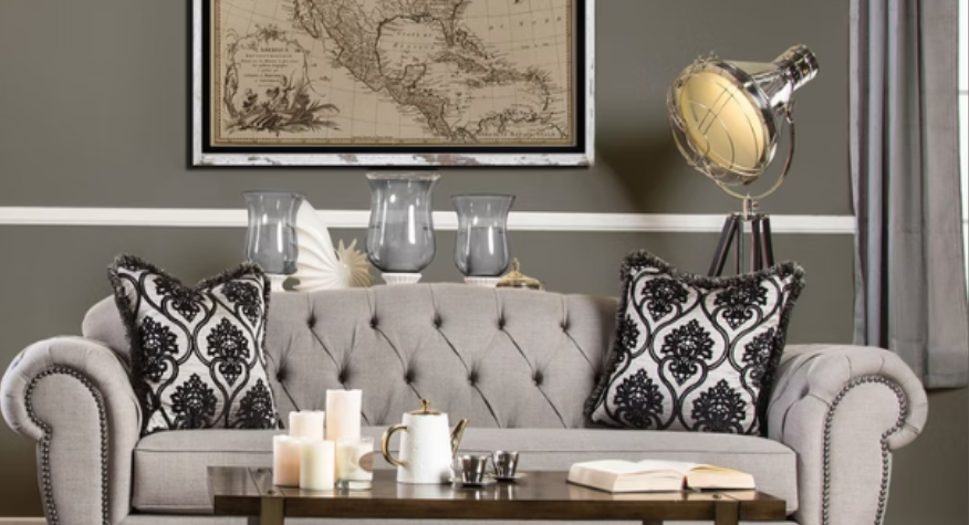 The essence of the classic chesterfield lives on in this beautiful sofa and love seat set. It features the same classic deep tufting, the nailhead trim, and rolled arms. The unique updated silhouette, however, brings it to the modern times. Contrasting, dark pillows pop on top of the gray fabric that's soft to the touch.