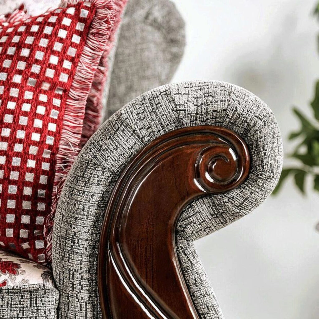 Traditional style sofa sets have unmistakable silhouettes monopolized by rolling arms. This collection co-opts the traditional design staples, like a detailed wooden trim but modernizes them with printed designs on the cushions and pillows. Floral patterns echo the rolling wood and trellis prints etched in brighter tones bring a pop of color that pulls the eyes to your lovely sofa set.