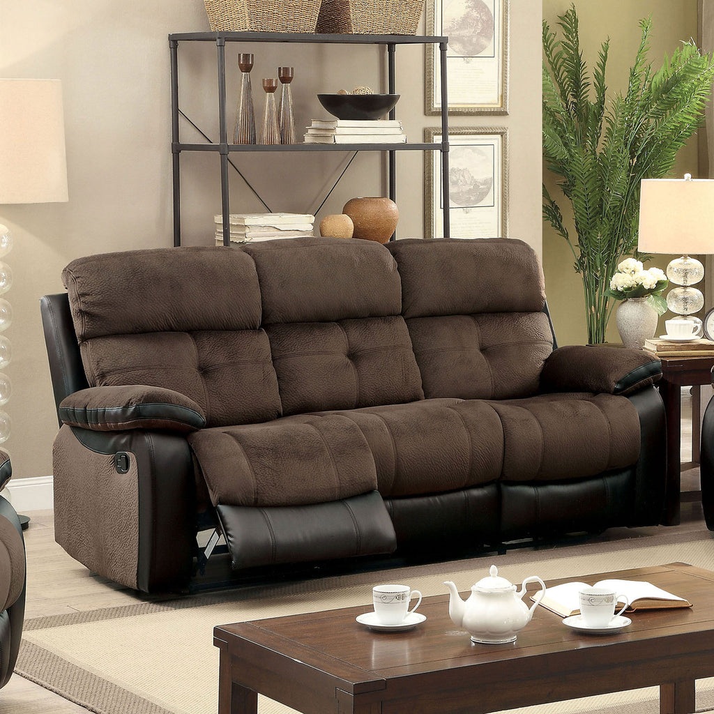 Free yourself from traditional sets and update your living space with this unique two-toned sofa collection. The dual usage of soft champion fabric and smooth leatherette off ers must-have comfort and one-of-a-kind style. Recline and relax without wo rries while resting upon this delightful set.