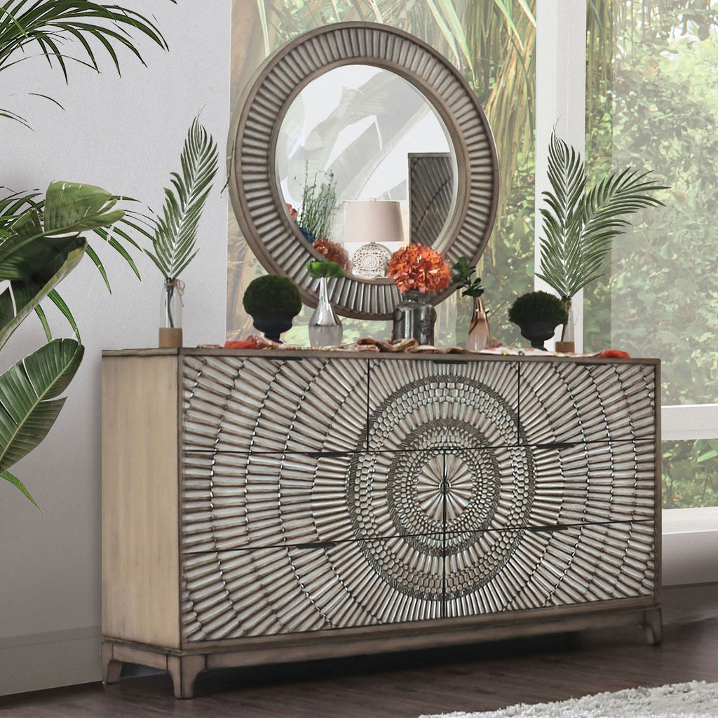 Give your bedroom a bold centerpiece. The worldly design brings a cultured aesthetic that can inspire your decor to be a bit more colorful. A variety of case good options dot the room with full circlet motifs that echo the awe-inspiring visual of the bed. An antique gray finish helps the pattern pop while giving you a lot of wiggle room for complimentary pieces and textiles to really bring the room together.