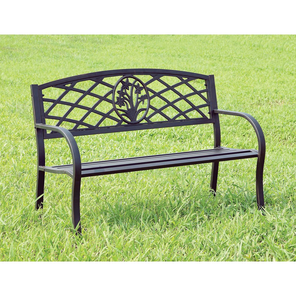 Made of durable steel, this reliable outdoor bench will make the perfect addition to any sized backyard. Featuring a unique designed backrest with side armrests.