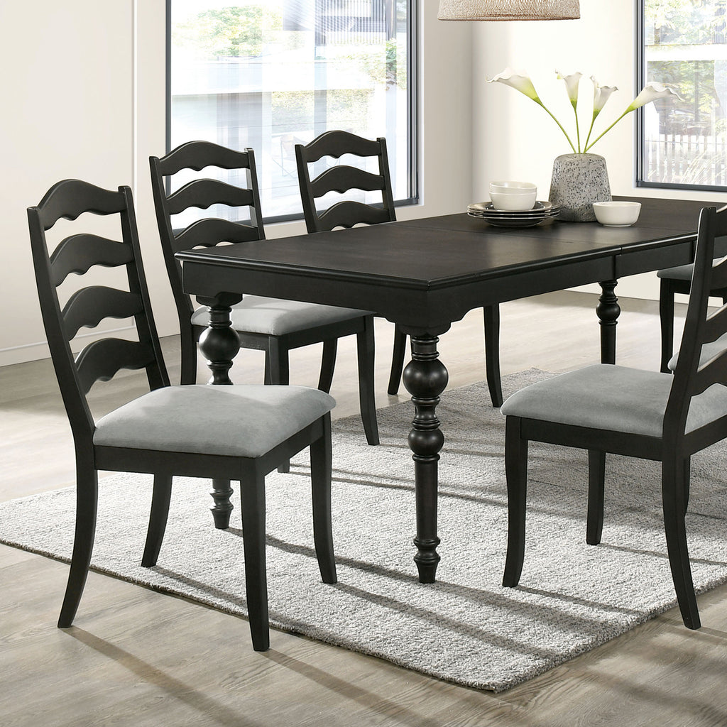 Nothing says grand like a large transitional dining table--especially if it's in an unexpected color like black. A statement piece like no other, the table legs are bold and turned while the ladder back chairs feature smooth curving lines that help soften the silhouette. Gray fabric seats offer contrast and pops against the dark frames, their smoothness pitied against the distressed look of the antique finish. With the top expandable by sixteen inches, there's more to fit in this visually arresting piece.