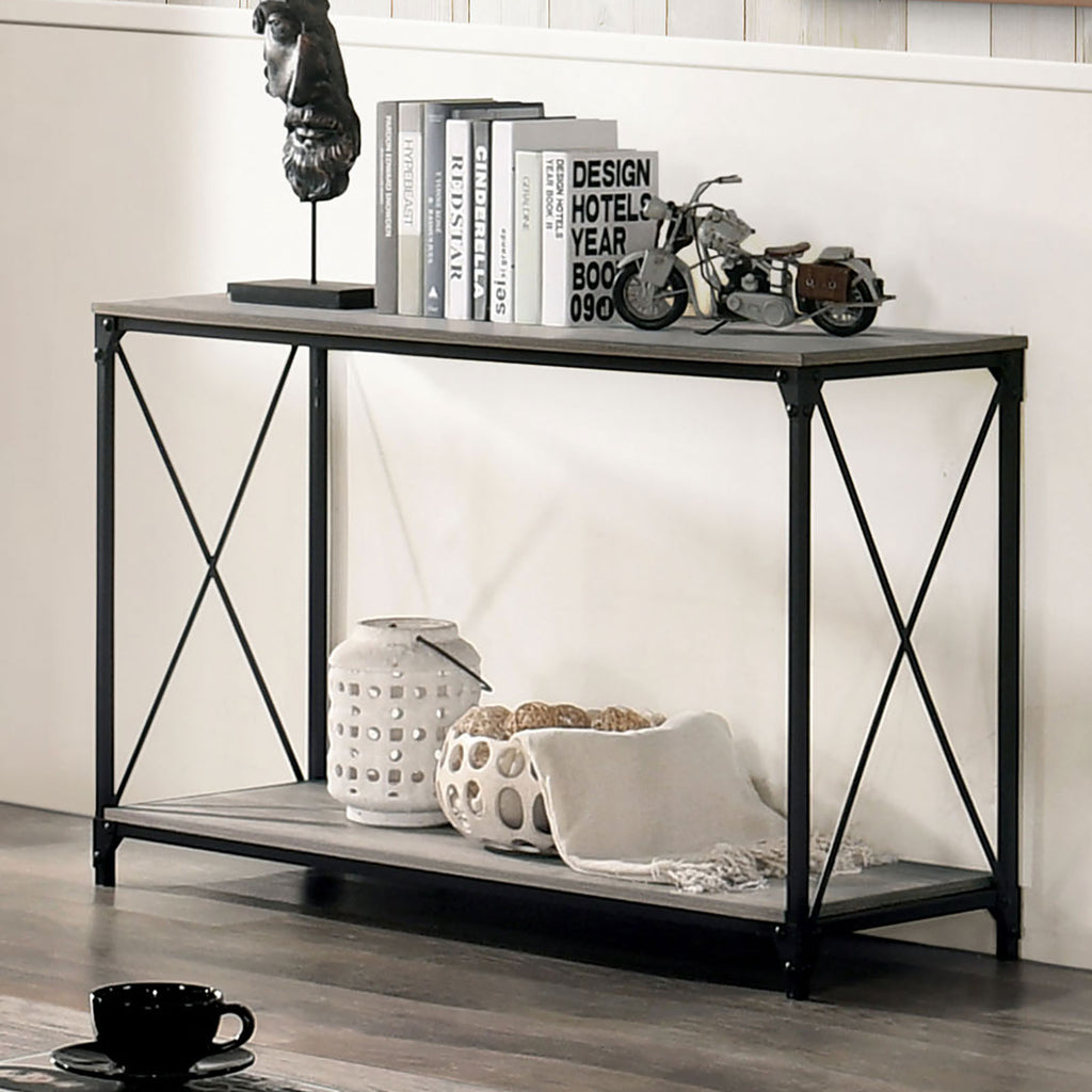 This sofa table is simple in design but full of expression with its mixed materials. The spacious top and bottom shelf beautifully mimic the texture and coloring of natural wood. The frame is made of metal with side supports and decorative corner rivets for that undeniable industrial look.